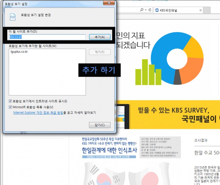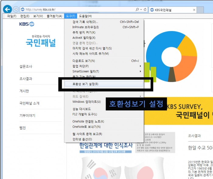 안녕하세요. 국민패널 운영자 입니다. 인터넷 사용중에 게시물 작성이 안되는 경우 또는 글쓰는 창이나 콤보박스 선택이 안되는 경우에는 IE (인터넷익스플로러) 11과 호환성 보기를 통해 문제를 해결할 수 있습니다. 아래의 방법에 따라 호환성 보기에 kbs.co.kr 을 등록해 주시기 바랍니다. 1. 인터넷 익스플로어에서 도구 -> 호환성 보기 설정 클릭