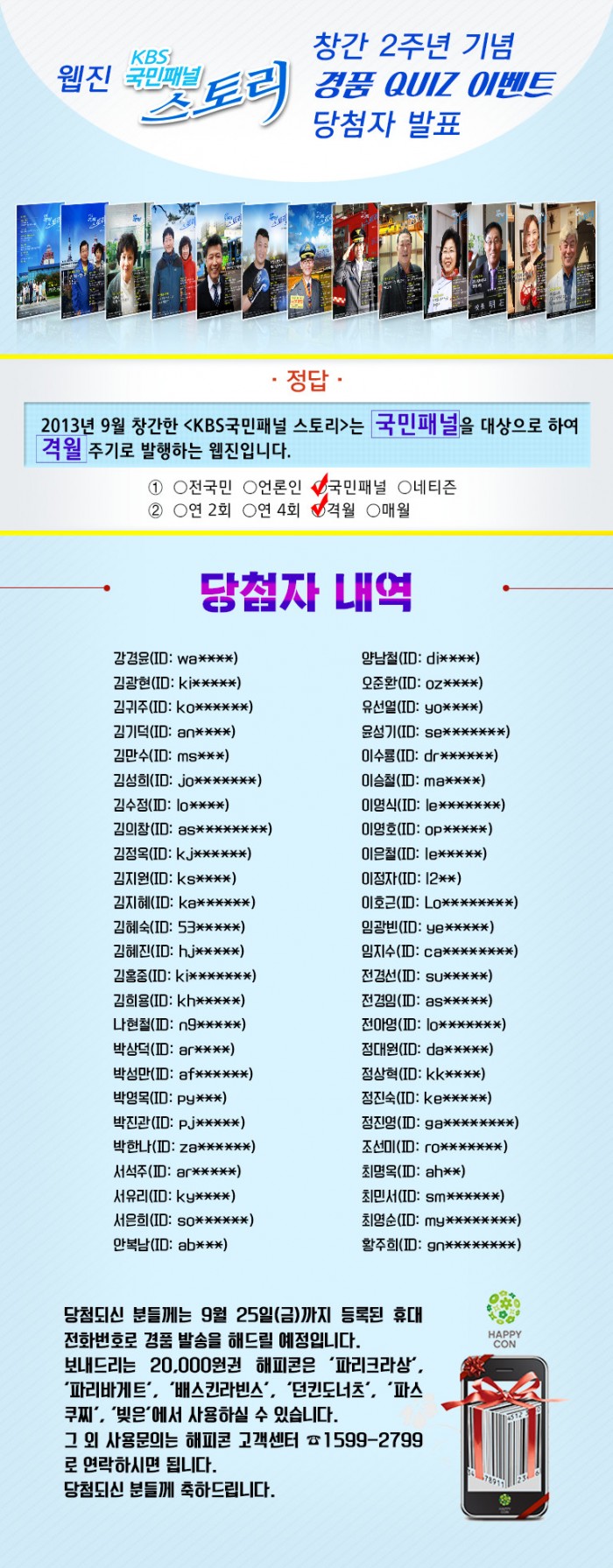 이벤트 당첨자 발표 - 웹진 [KBS국민패널 스토리] 창간 2주년 기념 경품 QUIZ